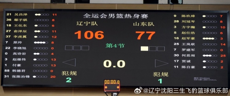 張陳治鋒20分 遼寧全運男籃106-77大勝山東 三戰(zhàn)全勝結(jié)束丹東站