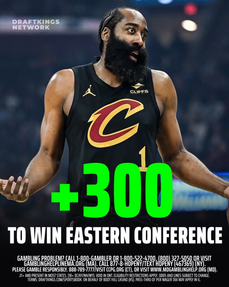 博彩網(wǎng)站 DraftKings Network更新了本賽季東部冠軍賠率,騎士以+300(押100,若中連本帶利得400)躍升至第一!