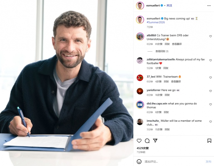 10月10日訊 穆勒今日在社媒更新了一條動態(tài)寫道:重磅消息即將揭曉,并帶上#2026夏天#的標簽,引發(fā)了球迷們的無限遐想,有球迷在穆勒社媒下猜測他可能會以教練組成員的身份參加2026年世界杯。