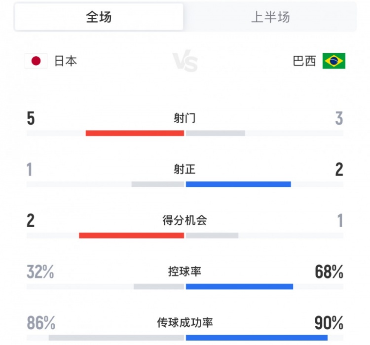 日本vs巴西半場數據對比(主隊日本隊在前)