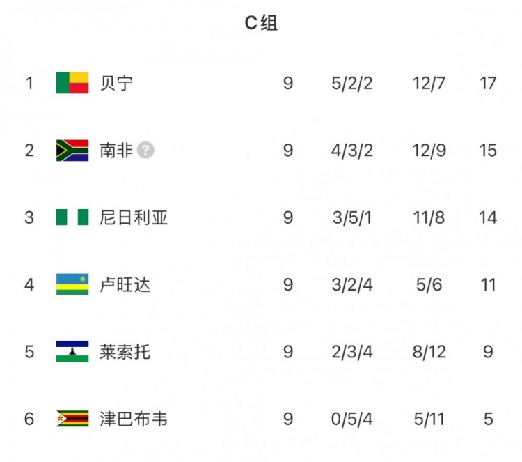 9輪過后,貝寧以17分領(lǐng)跑C組,領(lǐng)先第二名南非2分,第三尼日利亞3分。