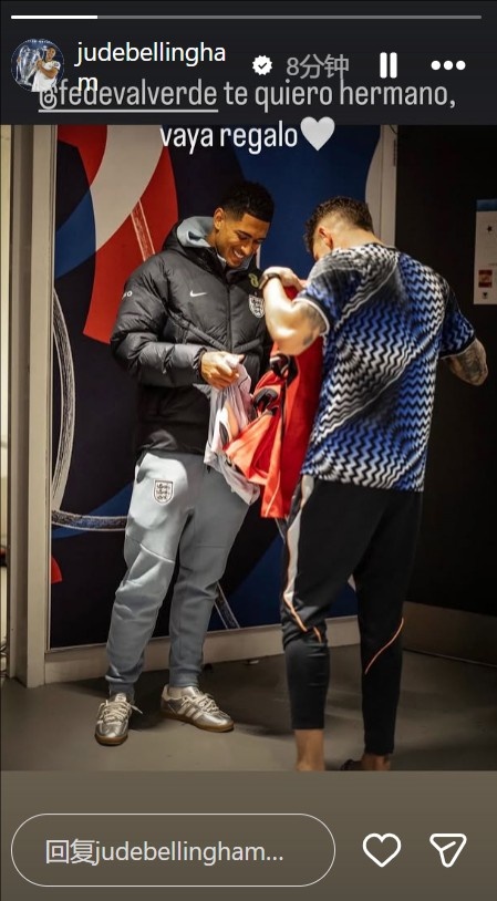 3月28日訊 英格蘭國腳貝林厄姆更新社交媒體,曬出與巴爾韋德互換球衣的照片。貝林厄姆寫道:“@巴爾韋德,我愛你,兄弟。多棒的禮物啊”在英格蘭1-1烏拉圭的熱身賽中,貝林厄姆沒有出場,巴爾韋德則踢滿全場并打進絕平點球。