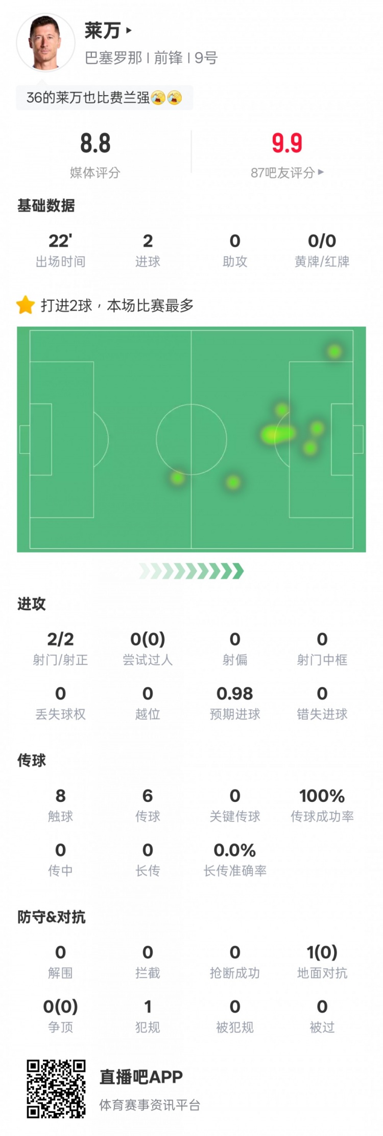 9月15日訊 2025-26賽季西甲聯(lián)賽第 4輪,巴薩 6-0瓦倫西亞,萊萬替補出戰(zhàn) 22分鐘, 2射門 2射正打進 2球,評分 8.8。
