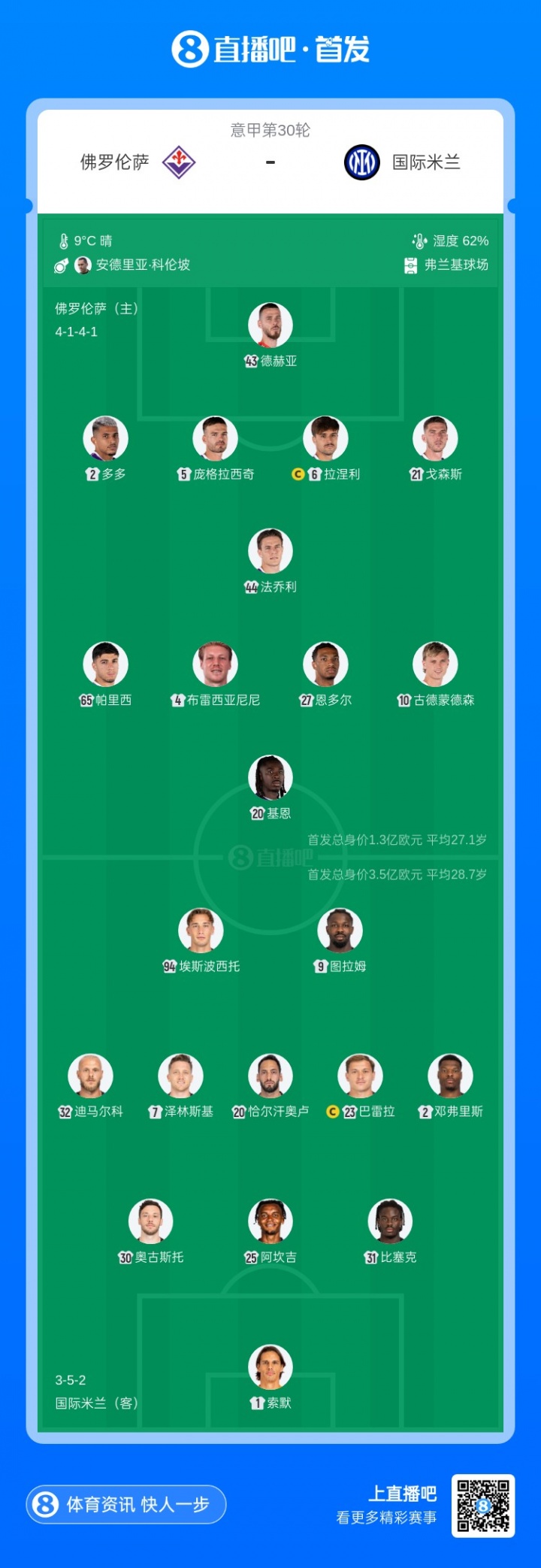 3月23日訊 北京時(shí)間3月23日3:45,意甲第30輪,佛羅倫薩vs國際米蘭。賽前雙方公布了本場比賽的首發(fā)陣容。
