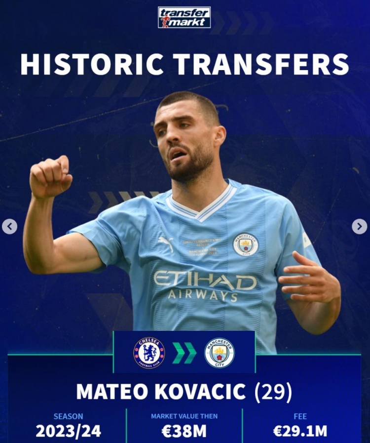 科瓦西奇(29歲):切爾西→曼城,23-24賽季,身價(jià)3800萬(wàn),轉(zhuǎn)會(huì)費(fèi)2910萬(wàn)