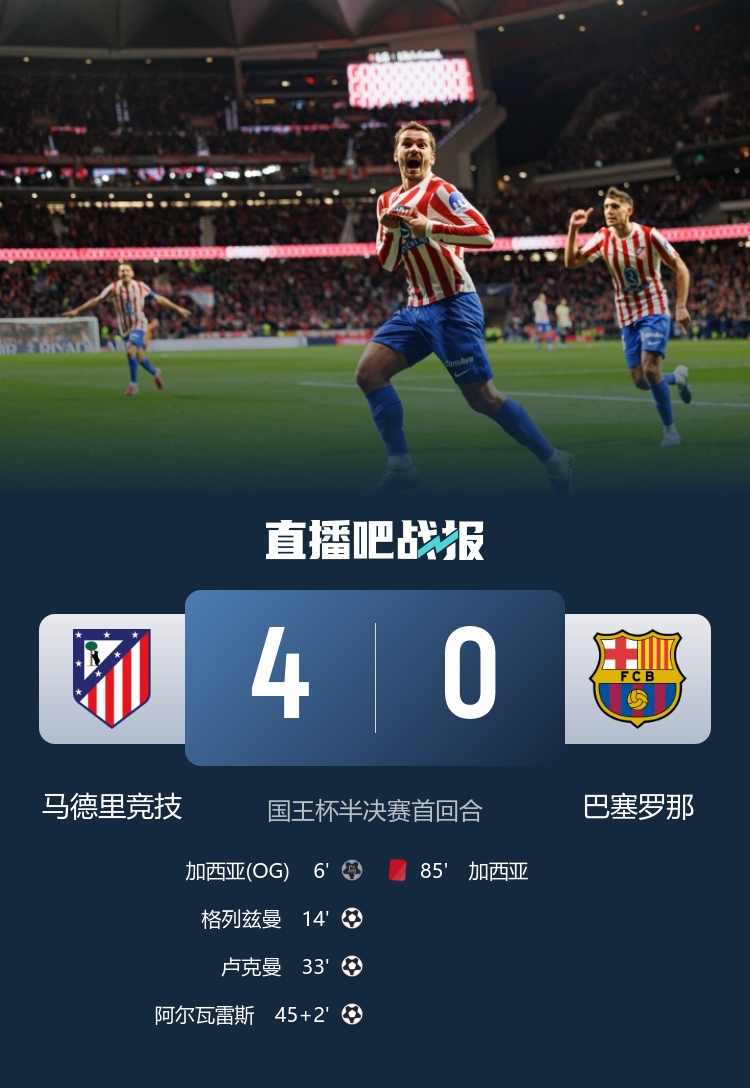 霍安失誤送禮,阿爾瓦雷斯、盧克曼互相傳射,庫(kù)巴西進(jìn)球被吹引爭(zhēng)議,埃里克·加西亞染紅;國(guó)王杯半決賽次回合3月4日移師諾坎普。