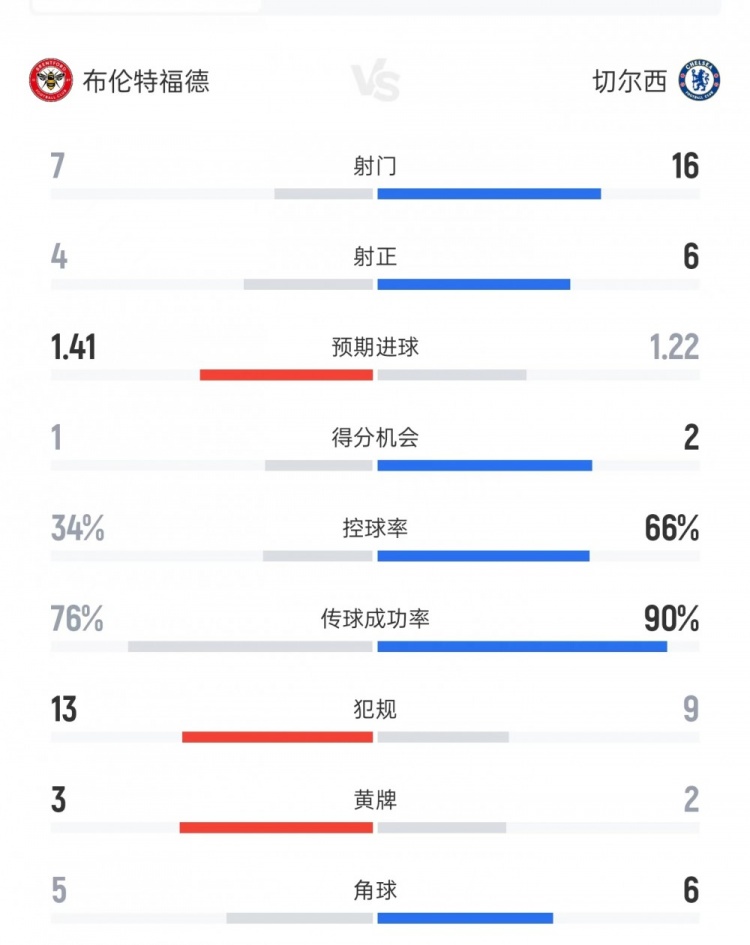 布倫特福德vs切爾西數(shù)據(jù):