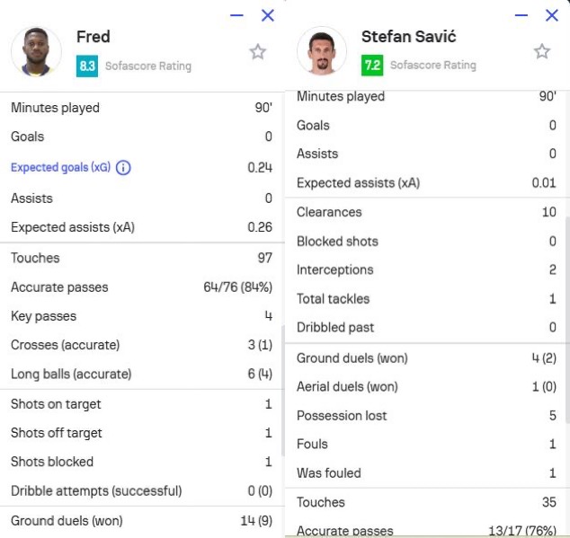 此外,曼聯(lián)舊將弗雷德(費(fèi)內(nèi)巴切)和曼城舊將薩維奇(特拉布宗體育)也都在本場(chǎng)比賽打滿全場(chǎng),弗雷德還獲評(píng)8.3分全場(chǎng)第二高。