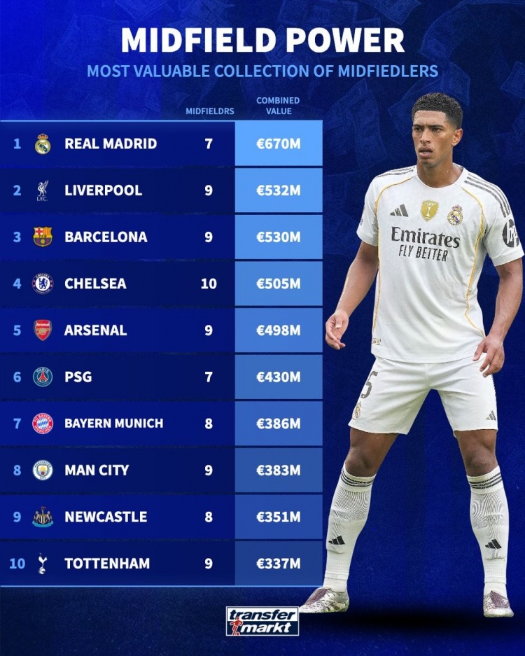 9月25日訊 日前,德轉(zhuǎn)統(tǒng)計了各隊中場球員總身價排行,皇馬7名中場總價6.7億歐居首。