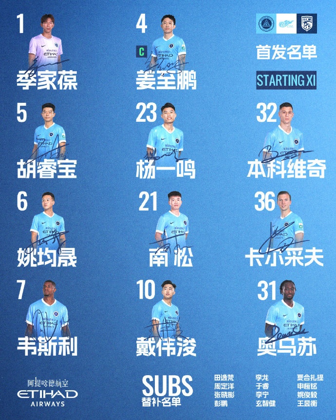 2-田逸梵 8-周定洋 12-張曉彬 13-彭鵬(GK) 14-李龍 15-于睿 17-李寧 20-玄智健 34-夏合扎提·吾加合買提 46-申桓銘 54-姚俊毅 56-王昱衡