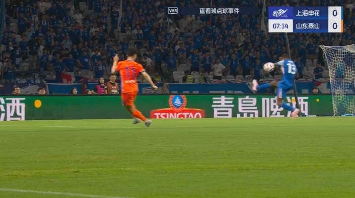 比賽第6分鐘,泰山球員投訴馬納法防守時(shí)手球,VAR檢查后確認(rèn)沒有犯規(guī),裁判示意比賽繼續(xù)。